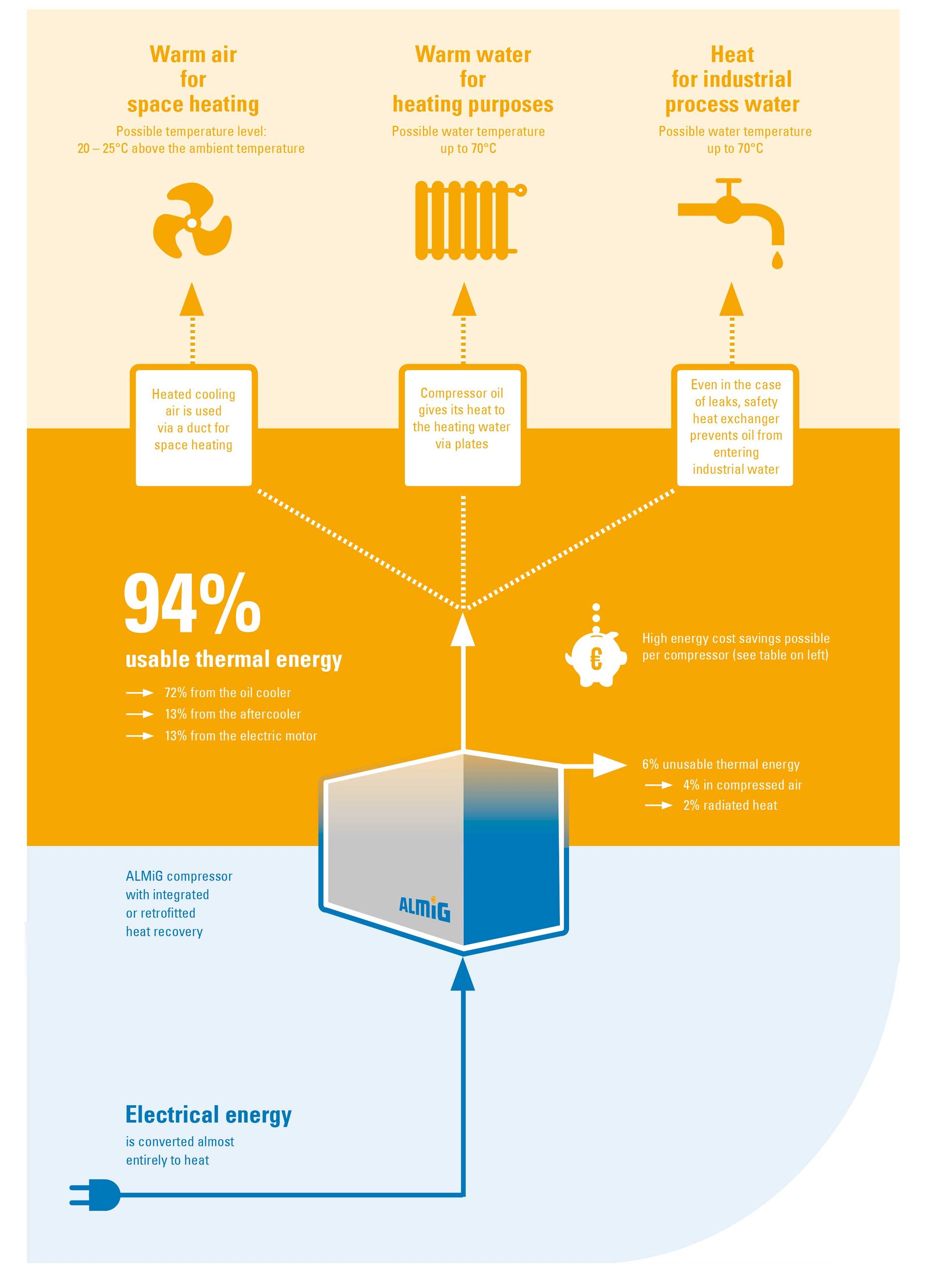 Электроэнергия, потребляемая для сжатия воздуха, практически полностью преобразуется в тепло.