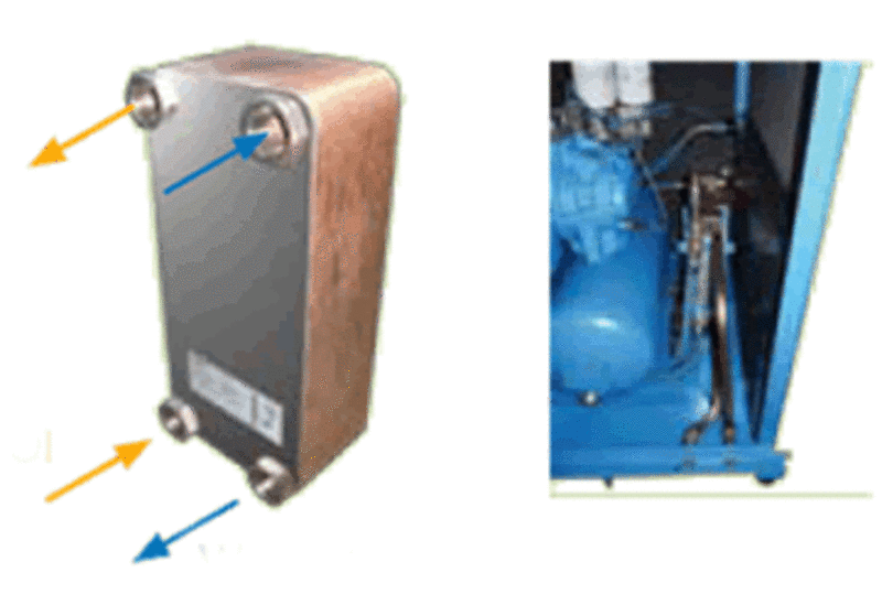 Для производства горячей воды используются пластинчатые теплообменники. Сетевая вода проходит через «пластины» в закрытом корпусе. Горячее масло компрессора течет между пластинами и корпусом и отдает свою тепловую энергию на нагрев воды.